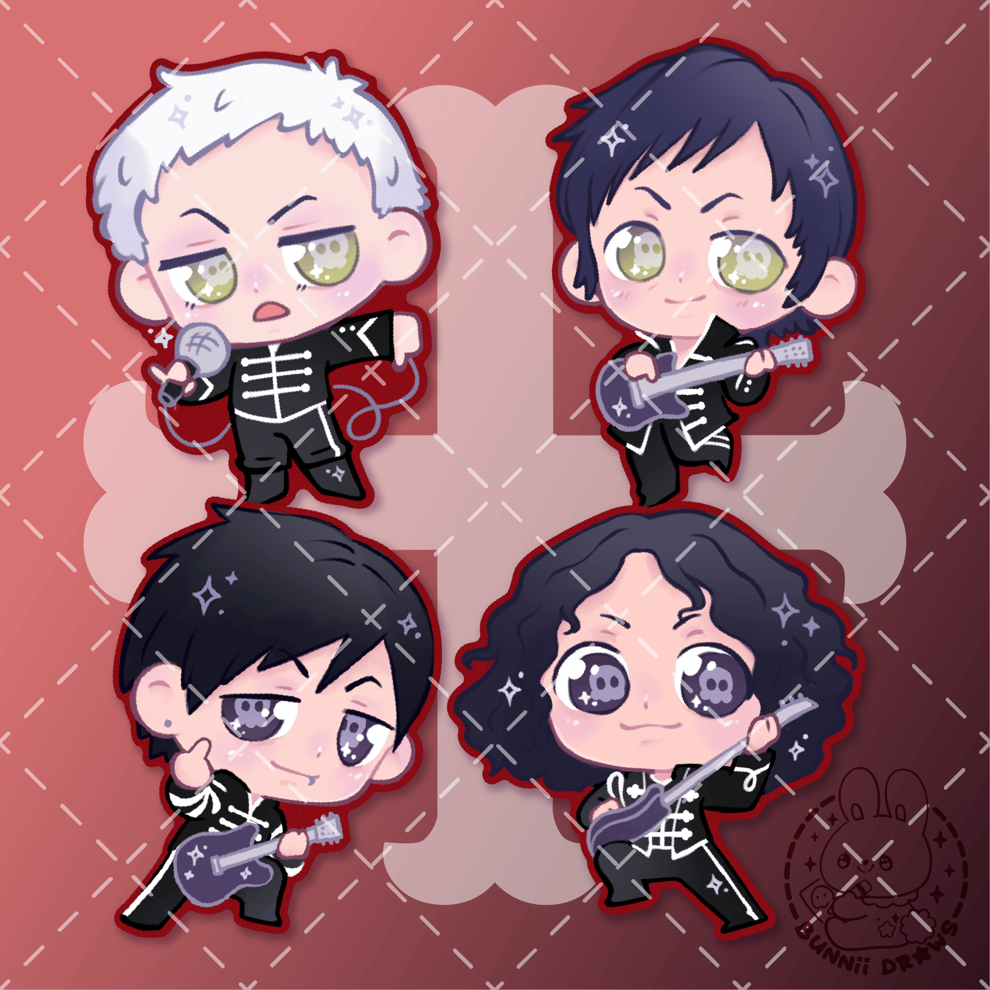 This is a set of 4 stickers from the Black Parade era of My Chemical Romance! You get 1 Gerard, 1 Frank, 1 Mikey, & 1 Ray